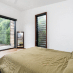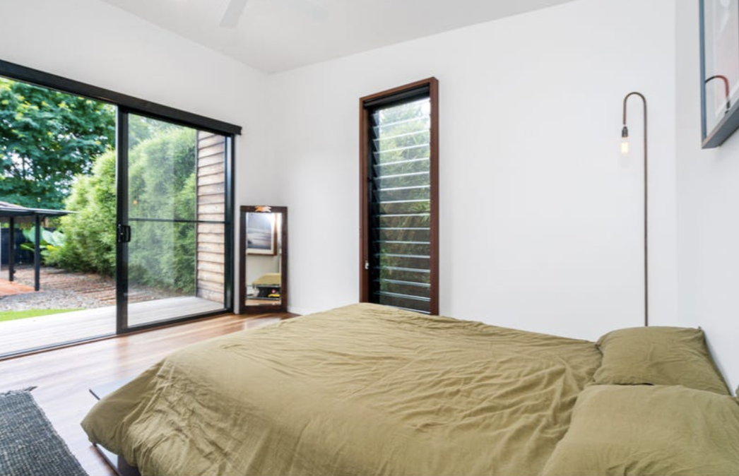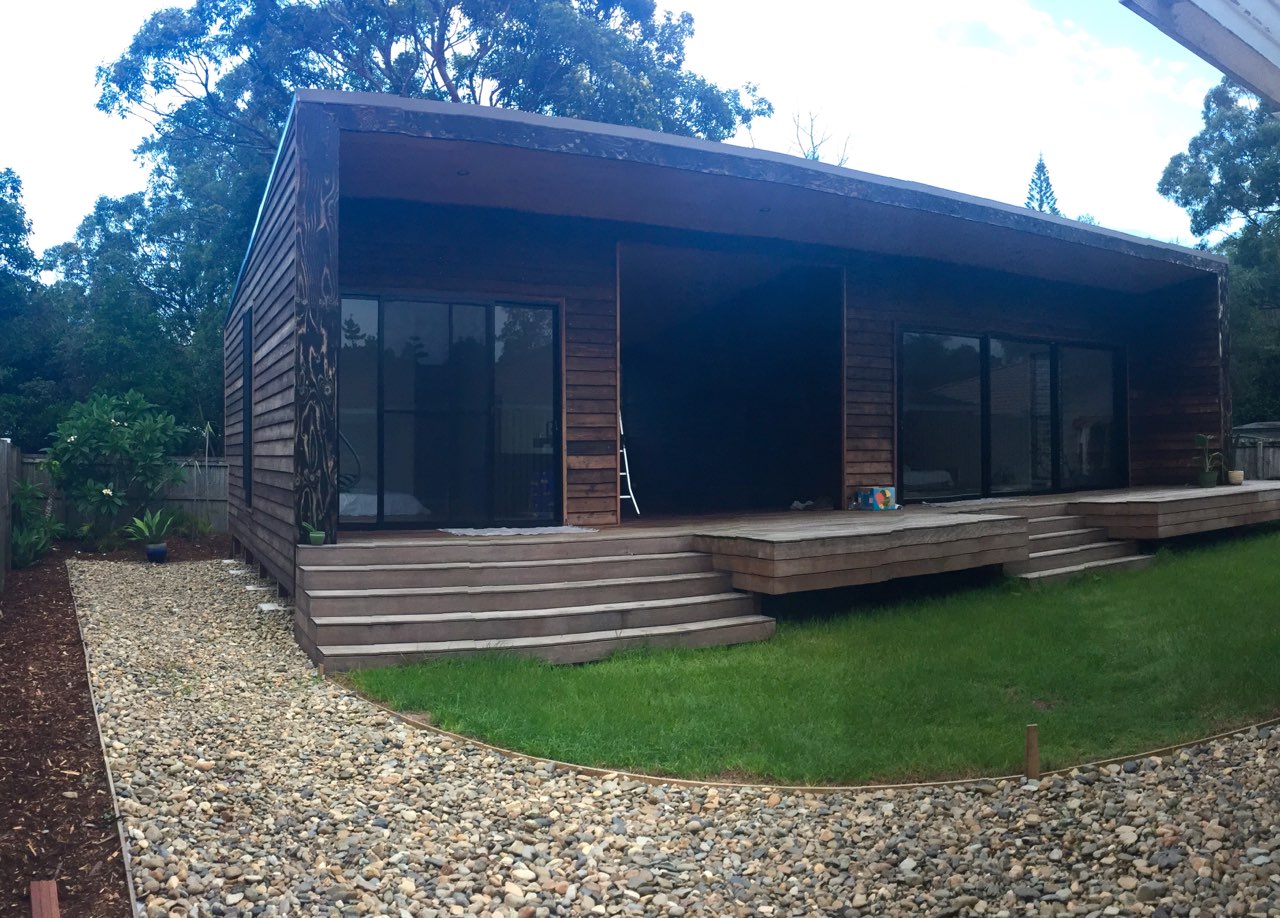 Nestled behind the main house, we designed this two-bedroom, two-bathroom home/work studio to perfectly encapsulate the lifestyle of a Byron Beach photographer with a passion for surfing. Maximizing the 60 square meter allowance for a NSW Granny Flat, the design extends the living area while maintaining a sense of privacy. The inclusion of an open-air dining void serves as a tranquil buffer between the two living units, allowing natural light and fresh air to permeate the space. Wide timber front steps invite relaxation in the sun, creating a seamless connection to the outdoors.